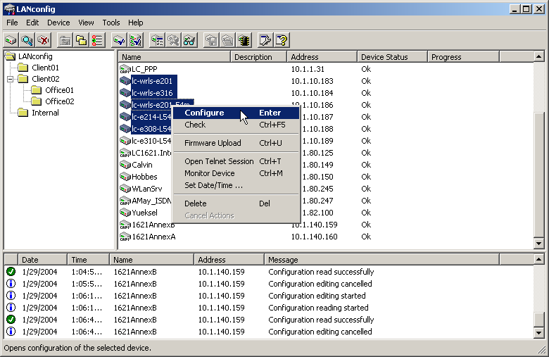 - Configure: Opens up the LANconfig configuration dialog for the selected device