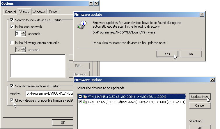 The directory where LANconfig is to search for the updates is set under Tools / Options / Extras. It is also possible to set up LANconfig to search the firmware archive and to check if any of the devices found require an update. With this option activated, starting LANconfig automatically displays all of the devices for which new updates are available.