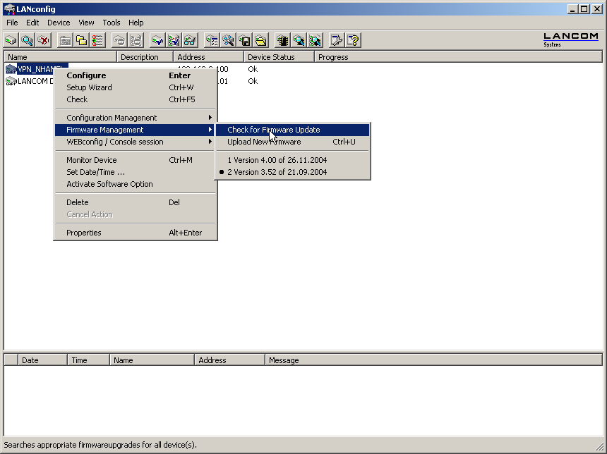 To search manually for firmware updates, click with the right-hand mouse key on a device marked in the list and select the following point from the context menu: Firmware management / Check for firmware update. If you wish to update several devices simultaneously, the entry Check for firmware updates is displayed directly in the context menu.