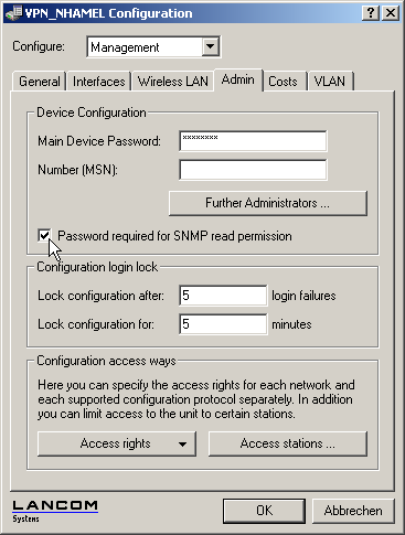 The read-only access to a LANCOM device via SNMP—for example with LANmonitor--can be password protected. This uses the same user data as with access to LANconfig. Password protection of SNMP access means that the user data must be entered before information about the device status, etc. can be accessed over SNMP.
