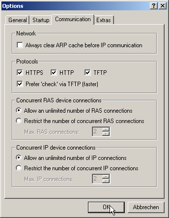 When setting up the communications protocols, one must differentiate between the protocol that is used solely for checking the device and for other operations such as a firmware upload, etc.:
