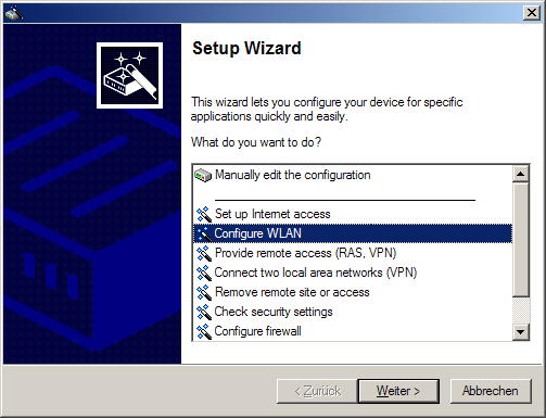 - In the selection menu, select the Setup Wizard, Configure WLAN interface and confirm the selection with Continue.