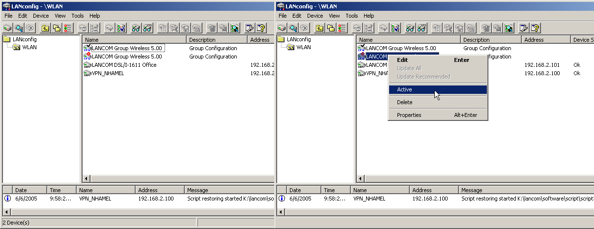 Multiple group configurations can be created within a single folder. Only one of these group configurations may be active at a time since the device status only relates to one group configuration. Active group configurations are indicated by a blue tick, inactive group configurations are indicated by a red cross. To activate a group configuration, click on the entry with the right-hand mouse key and select Active from the context menu. All other group configurations are then deactivated automatically.