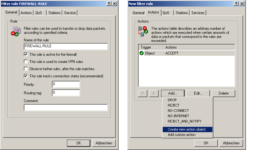 When creating a new firewall rule, the general data is entered first. Objects already defined can be selected directly from the tabs for Actions, QoS, Stations and Services. New objects that can also be used in other rules can be created here, as user-defined entries that are only to be used in the active firewall rule.