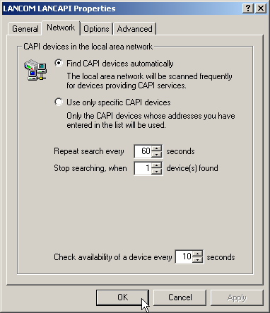 - In the event that the client should not automatically search for servers, list the IP addresses of the servers to be used by the client. This can be useful if you are operating several LANCOM in your LAN as LANCAPI servers and you would like to specify a server for a group of PCs, for example.