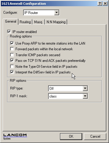 For configuration with LANconfig adjust on index card 'General' whether the 'Type of service field' or alternatively the 'DiffServ field' is to be observed for prioritization of data packets. When both options are turned off, the ToS/DiffServ field will be ignored.