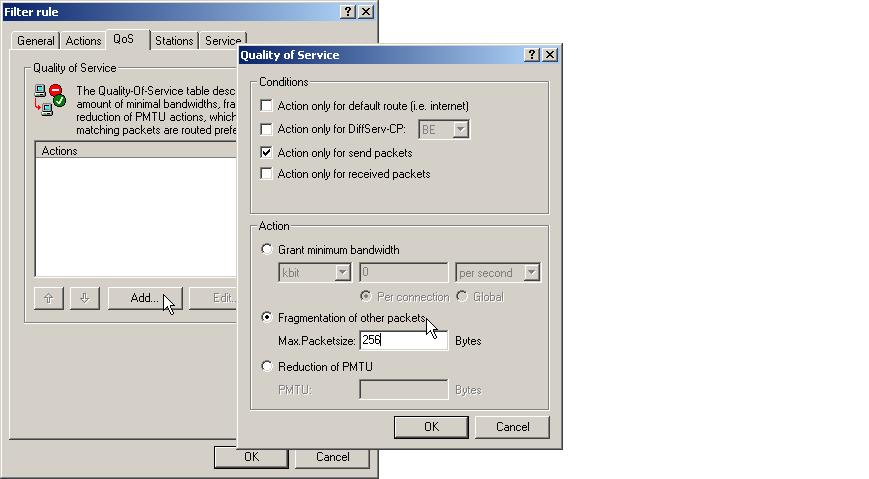 This rule defines the minimum bandwidth for sending and receiving to 32 Kbps, forces and reduces the PMTU while sending and receiving to packets of 256 byte size. For the TCP connection, the maximum segment size of the local workstation is determined to 216, so that the server will send packets of maximum 256 byte (reduction of the PMTU in sending and receiving direction).