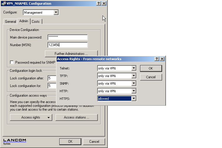 The access to the internal functions can be controlled separately for accesses from the local or from remote networks - for all configuration services separately. The configuration access can generally be permitted or forbidden, a pure read access or - if your model is equipped with VPN - also can be permitted only over VPN. You can open the configuration dialogue with the access rights from the local or from remote networks over the button access rights: