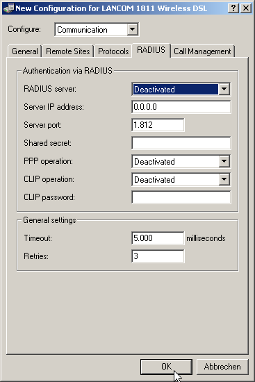 - Enabled: The functionality of RADIUS is enabled and requests may be forwarded to the configured RADIUS server. Depending on the setting, other sources may be used for the authentication process (e.g. PPP list).