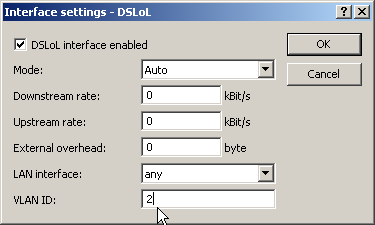 In order to better separate the data traffic on a DLSoL interface from other traffic, 'VLAN ID' can be set up for the DSLoL interface under Setup/Interfaces/DSLoL or in LANconfig in the configuration area 'Interfaces' using the 'WAN' tab under the interface settings for the DSLoL interface.