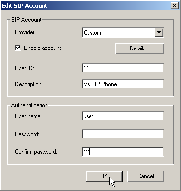 - Enter the SIP-account user name and password for logging in to the SIP PBX.