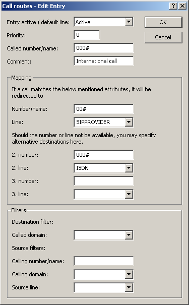 - Adapt the suggested call routing table in order to direct calls to special numbers automatically over the SIP provider's line. The following example shows the entry for international calls.