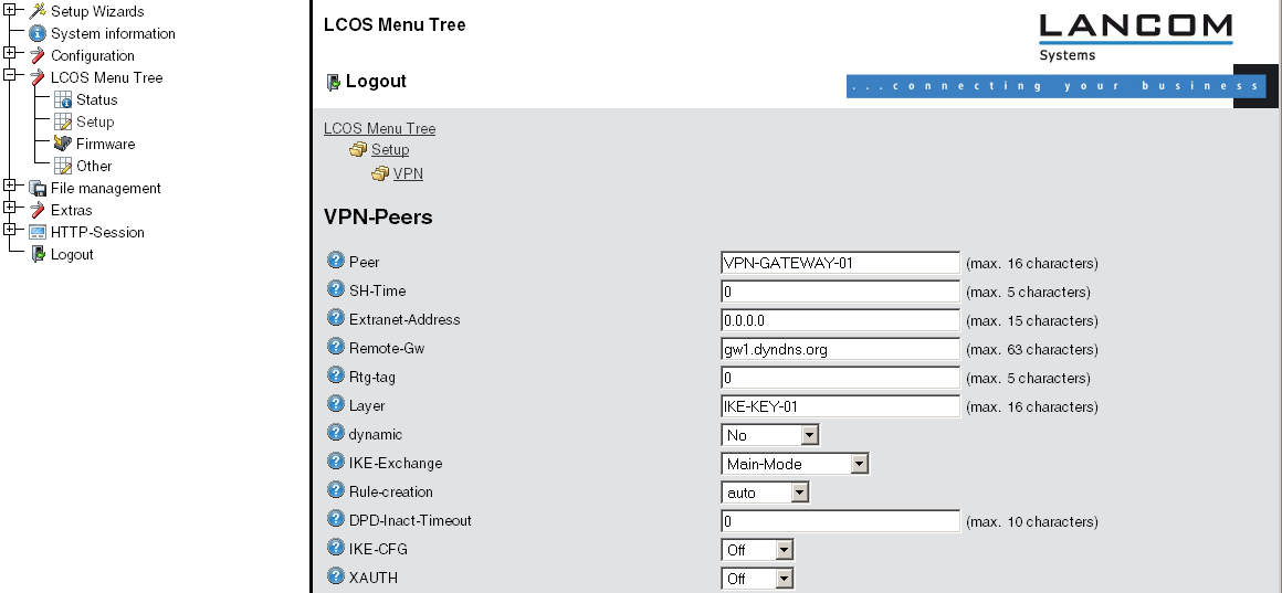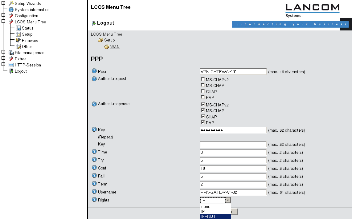 - When using LANCOM Dynamic VPN: Under Configuration / Setup / WAN module / PPP list make a new entry. Select the remote VPN gateway as the remote site, enter the User Name as the name of the VPN connection that the remote VPN gateway uses to address the local device, and enter a suitable password that is identical at both locations.