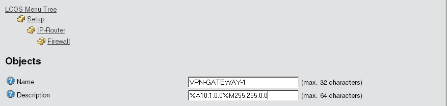 IP address Net mask Router IP masquerading 10.1.0.0 255.255.0.0 VPN gateway 1 No 10.2.0.0 255.255.0.0 VPN gateway 1 No 10.3.0.0 255.255.0.0 VPN gateway 1 No These entries enable VPN gateway 2 to forward packets arriving from the remote network to the correct sections of the local network.IP address Net mask Router IP masquerading 10.5.0.0 255.255.0.0 10.4.00.5 No - Under Configuration / Firewall/QoS / Object table make an entry for each part of the network that should be used as a source or destination for the VPN connection via “VPN GATEWAY 1” (“VPN-GW1-LOCAL” and “VPN-GW1-REMOTE”). Enter each subnet in the form “%A10.1.0.0 %M255.255.0.0”.