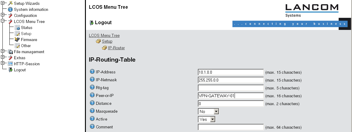 - Under Configuration / Setup / IP router module / IP routing table generate a new entry for each network portion that should be accessible in the remote and in the local LAN. In each case, define the router as the remote VPN gateway and switch the IP masquerading off.
