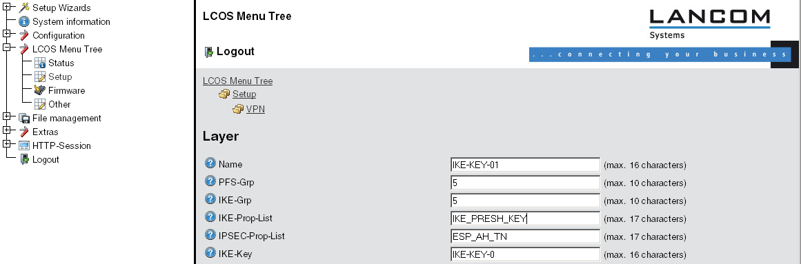 - Under Configuration / VPN / IKE-Param. / IKE key set a new IKE key for the connection: