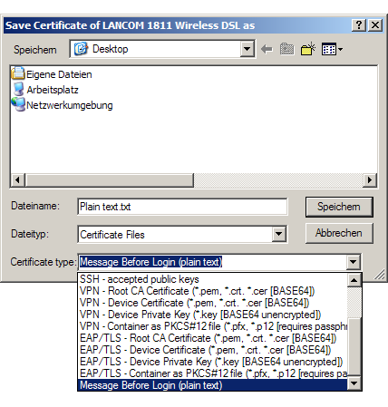 Various certificates can be used in a LANCOM for the encryption of certain services. These certificates can be uploaded to the devices by using LANconfig. Furthermore, the certificates in a device can also be read by LANconfig and stored to a file.