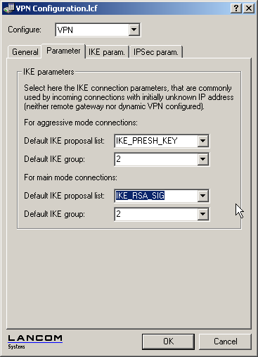 - Finally, the VPN connection parameters must be set up to use the correct IKE proposals ('IKE_RSA_SIG'). The values for 'PFS group' and 'IKE group' must agree with the values set in the IKE connection parameters. Configuration with LANconfig