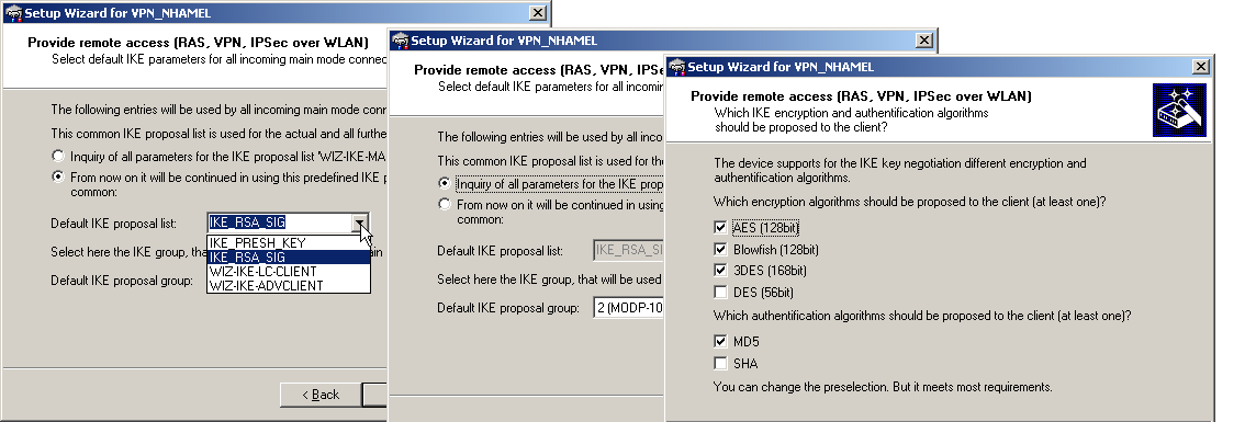 - If you wish to use different parameters for incoming main mode connections, you can adapt the standard IKE parameters to fit your requirements. You can either create a new list 'WIZ-IKE-MAIN-MODE' or you can select one of the existing IKE proposal lists as the new "Standard IKE proposal list". The list defined here will be used for all incoming main mode connections in the future. For a new IKE proposal list, you can select the encryption and authentication methods that are to be used by the client during the IKE negotiation.