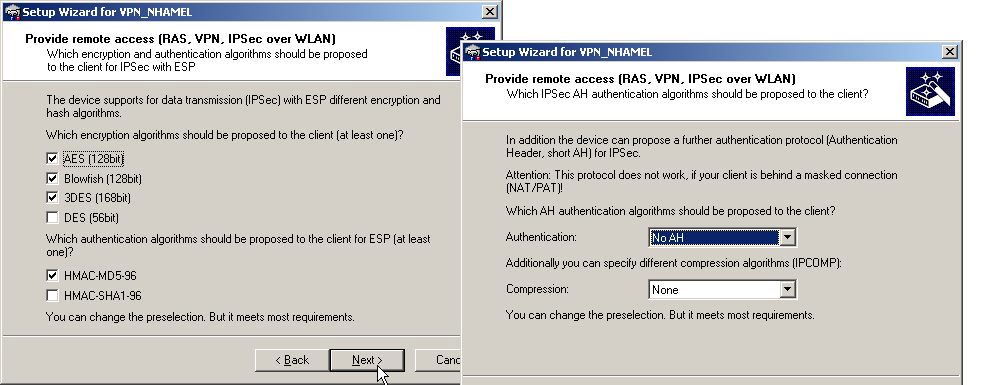 - The following dialogs define the encryption and authentication methods, the authentication header and the data compression that the client will use for the transfer of the payload data with IPSec. Use the preset values as much as possible as long as the client does not demand different settings.