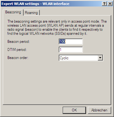 Settings in the beaconing table influence the transmission of beacons by the access point in AP mode. In part this can influence the roaming behavior of clients, and in part this serves to optimize the MultiSSID mode for older WLAN clients.