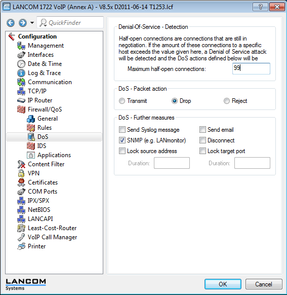 Your device detects most of these attacks and reacts with appropriate countermeasures. Detecting these attacks relies on counting the number of connections which are concurrently under negotiation (half-open connections). If the number of half-open connections exceeds a certain threshold value, then the device assumes that a DoS attack is underway. The actions and measures which are taken in this case can be defined, similar to firewall rules.