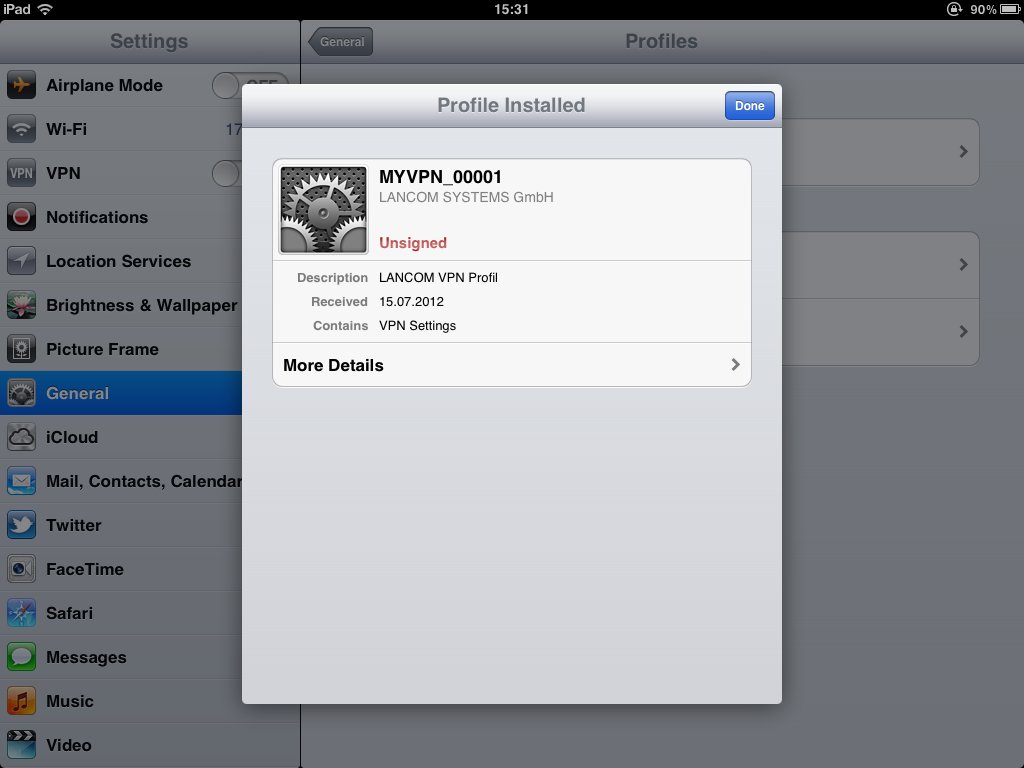 Once retrieved from an iOS device, the myVPN profile is disabled on the LANCOM VPN device.