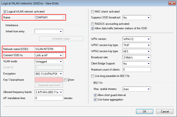 The aim of the configuration: A WLAN client that associates with the internal SSID should have access to all internal resources and the Internet via the central gateway. The access points break-out the payload data from the internal clients locally and pass it on directly to the LAN. The guests' WLAN clients associate with the Public Spot. The access points send the payload data from the guest clients through a WLC tunnel directly to the WLAN controller, which uses a separate WAN interface for Internet access.