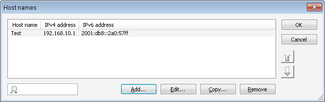 When the DNS server in your device receives a query about a station name, it responds with the IP address contained in the Host names list. For each station/host name you define either the IPv4 or the IPv6 address, or alternatively you can enter both IP addresses.