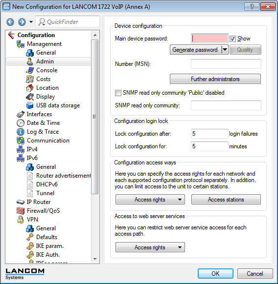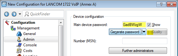 LANconfig provides the option to automatically generate a password at all points in the configuration, which require the input of a password or a passphrase.