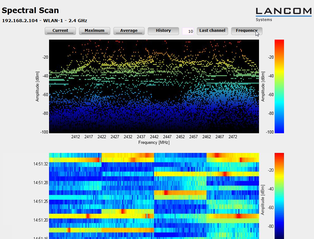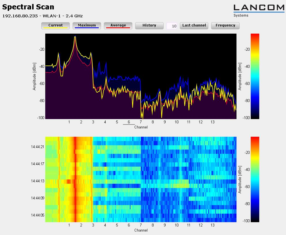 - Average: Shows or hides the average values of the ongoing spectrum scan in relation to the currently set history range.