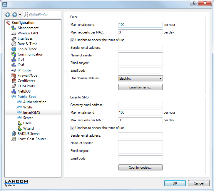 - Max. e-mails send: Here, enter the maximum number of e-mails that the Public Spot module may send per hour to users authenticating via e-mail. Lower the value to reduce the number of new users per hour.