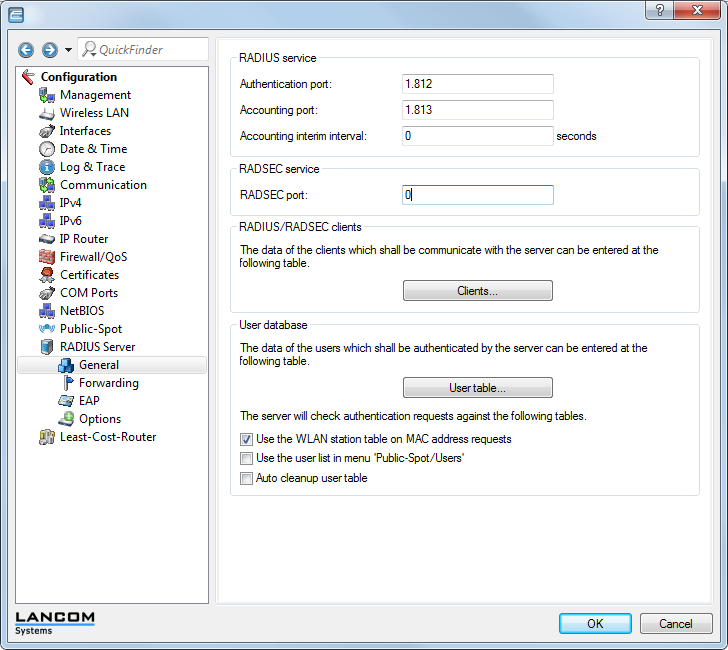 Here you activate the interfaces which will be available to registered users. Along with the logical WLAN interfaces which Public Spot users directly login to, the logical LAN interfaces (LAN-1, etc.), and the point-to-point connections (P2P-1, etc.) can also be selected. When connected via the LAN or P2P interface, you can integrate additional access points into a LANCOM Wireless router Public Spot. For an access point select, for example, the logical WLAN interface WLAN-1.