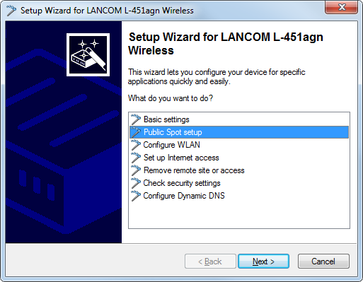Start the Setup Wizard with , select the action Setup Public Spot and then click Next.