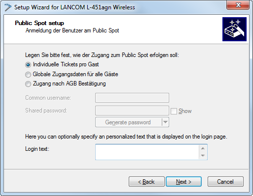 Specify which login data your users are to use to login to the Public Spot. Also, you can optionally add customized text to the login page. To continue, click on Next.