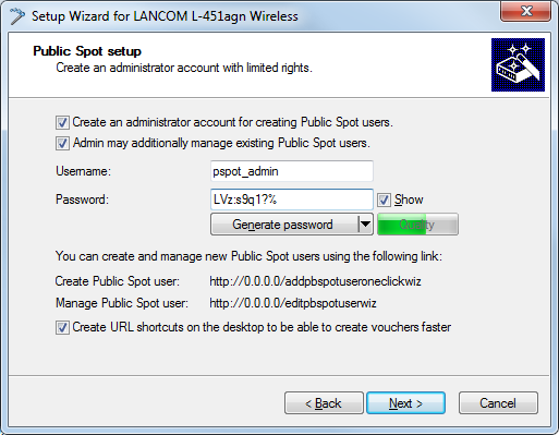 If necessary, create an administrator with limited rights who can use the setup wizards in WEBconfig to create and manage Public Spot users. To continue, click on Next.