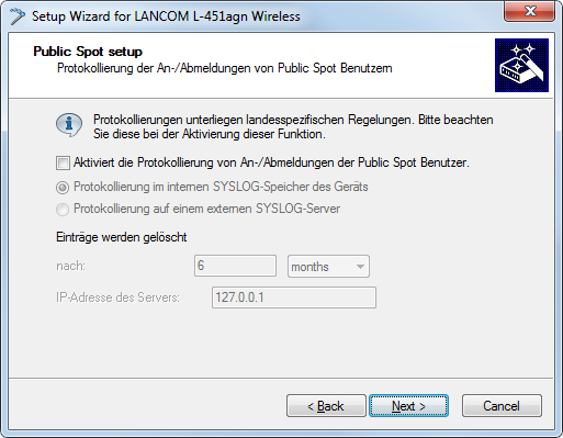 If needed, enable logging of logins and logouts for Public Spot users in the internal SYSLOG storage of your device. To continue, click on Next.
