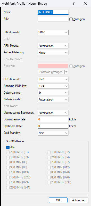 Es wird empfohlen ggf. vorhanden WWAN-Gegenstellenkonfigurationen (inkl. der Default