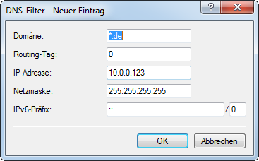 Anmerkung: Bei der Eingabe der Domäne sind auch die Wildcards '?' (steht für genau ein Zeichen) und '*' (für beliebig viele Zeichen) erlaubt.Um nur einem bestimmten Rechner (z. B. mit IP 10.0.0.123) den Zugriff auf DE-Domains zu sperren, tragen Sie folgende Werte ein:Im Konsolenmodus lautet der Befehl: set 002 *.de 10.0.0.123 255.255.255.255