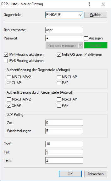 Dazu wird der Benutzer 'Einkauf' als Gegenstelle ohne Benutzername, aber mit einem gemeinsamen Kennwort für alle Mitarbeiter in der Abteilung in der PPP-Liste angelegt (LANconfig: ) und die Authentifizierung (verschlüsselt) über CHAP vorgegeben. Für diesen PPP-Benutzer wird das IP-Routing aktiviert: