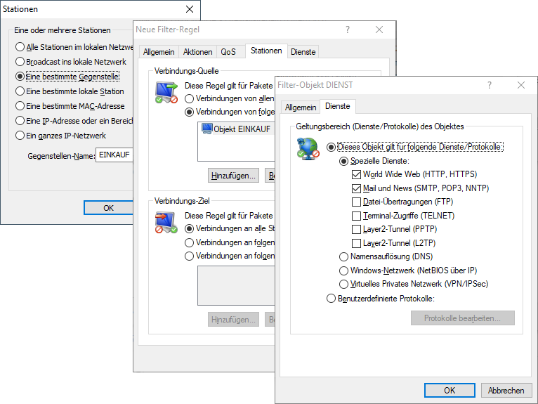 Mit Hilfe der Firewall (LANconfig: ) können die erlaubten Dienste für die Mitarbeiter des Einkaufs gesteuert werden (z. B. nur Freischalten von HTTP und EMAIL).