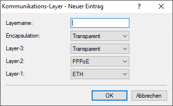 In der Kommunikations-Layer-Liste sind die gängigen Protokollkombinationen bereits vordefiniert. Änderungen oder Ergänzungen sollten Sie nur vornehmen, wenn Gegenstellen inkompatibel zu den vorhandenen Layern sind. Die möglichen Optionen finden Sie in der folgenden Übersicht.