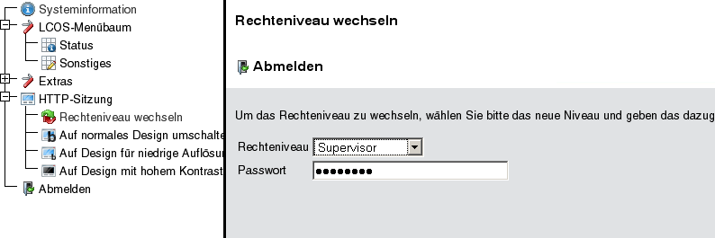 Das zugehörige Kennwort wird im nächsten Dialog abgefragt. Nach dem Login sieht der Benutzer zunächst nur eine eingeschränkte WEBconfig-Oberfläche. Wenn die Autorisierung nicht genutzt wird, haben alle Benutzer (außer der Benutzer root) unter WEBconfig zunächst nur Leserechte.