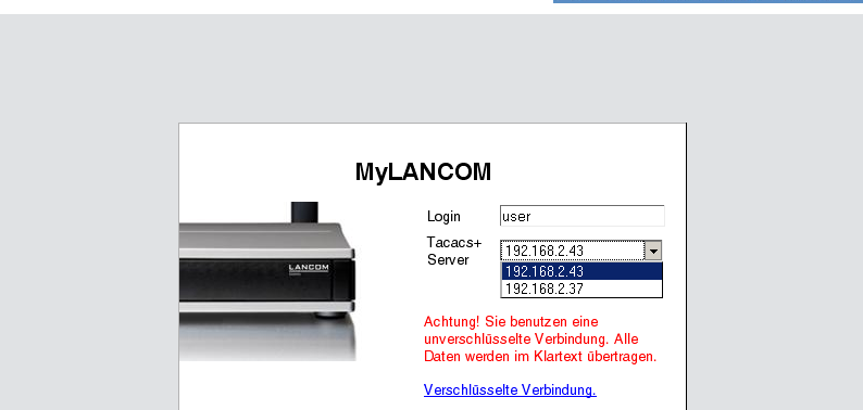 Die Anmeldung über WEBconfig an einem Gerät mit aktivierter TACACS+-Authentifizierung gelingt allen Benutzern, die im TACACS+-Server konfiguriert sind. Geben Sie beim Login über WEBconfig den Benutzernamen ein, der im TACACS+-Server konfiguriert ist, und wählen Sie den Server aus, an dem die Authentifizierung vorgenommen werden soll.