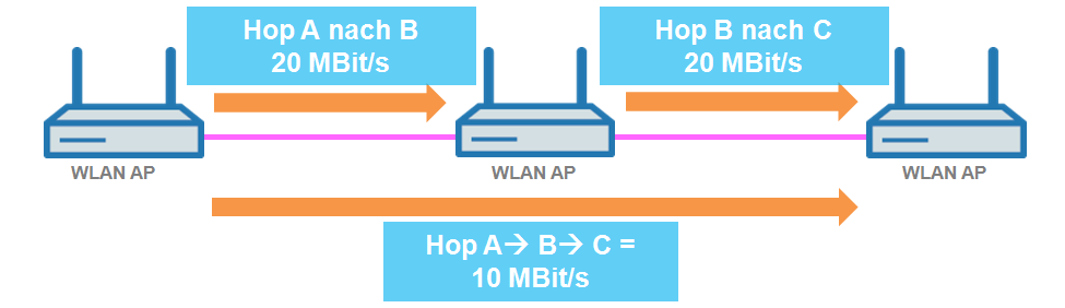 Durchsatz-Reduzierung durch Mehrfachübertragung: Überträgt ein AP Datenpakete auf dem gleichen Kanal mehrfach, reduziert sich in der Praxis der maximal erreichbare Durchsatz (Halbierung pro Hop).
