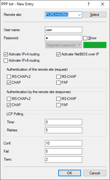 The user 'Purchasing' is then entered into the PPP list (LANconfig: ) and authentication (encrypted) is set up as CHAP. IP routing is to be activated for this PPP user:
