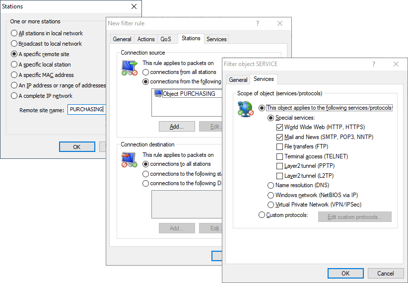 The firewall (LANconfig: )can be used to control which services are available to the employees in Purchasing (e.g. release of HTTP and EMAIL only).