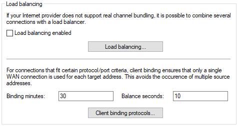 For each destination address, client binding can assign connections that correspond to certain protocol/port combinations to a fixed WAN connection. This avoids changing source addresses when using these connections. Client binding may be activated during load balancing.