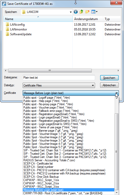 Various certificates can be used in a device for the encryption of certain services. These certificates can be uploaded to the devices by using LANconfig. Furthermore, the certificates in a device can also be read by LANconfig and stored to a file.