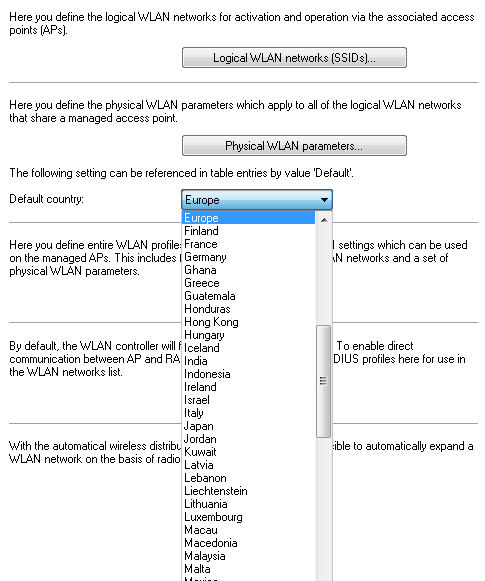 - Default countryThe country in which the access points are to be operated. This information is used to define country-specific settings such as the permitted channels, etc.